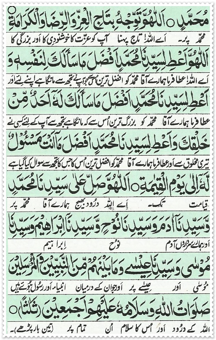 Transliteration: Allahumma salli alla rohi Sayeedina Muhammadin fil arwahi wa’alla jasadihi fil ajsadi wa’alla qabrihi fil qooburi wa’alla allihi wasahbihi wasallim allahumma salli alla Sayeedina Muhammadin qullama zakarahuz zakiroon allahumma sallai alla Sayeedina Muhammadin qullama gaffala an zikrihil qafiloon allahumma salli wasllim wabarik alla Sayeedina Muhammadin nabbiyil oummiyi wa’ajwajihi oummahattil muminina wuzrriyattihi wa’ahlli bait’tihi sallatou wasallamal laa